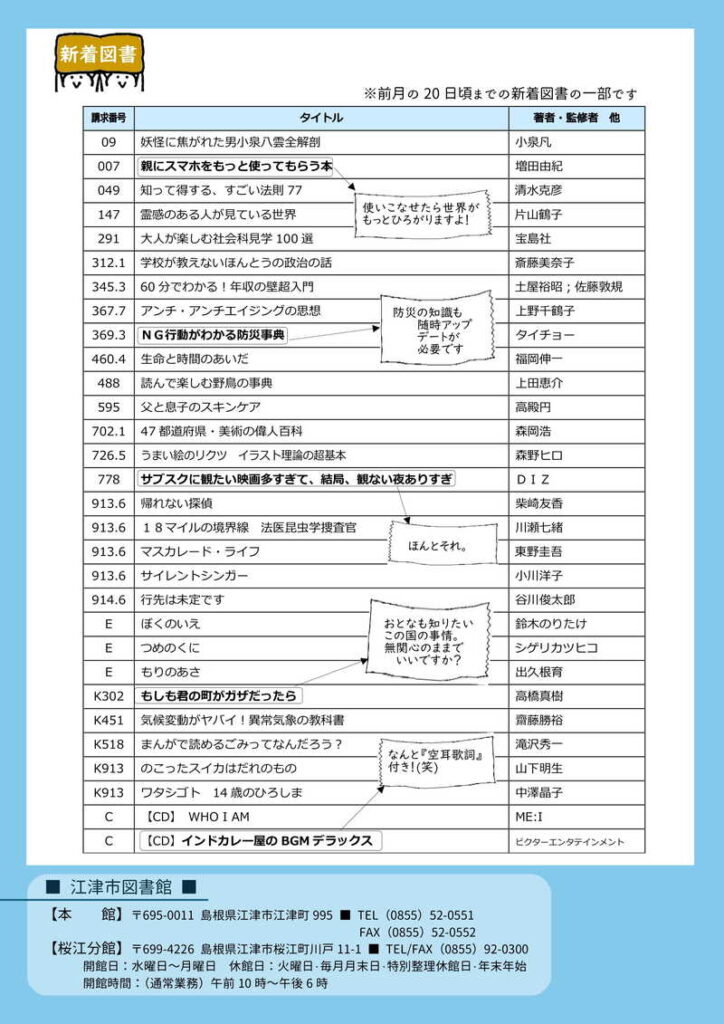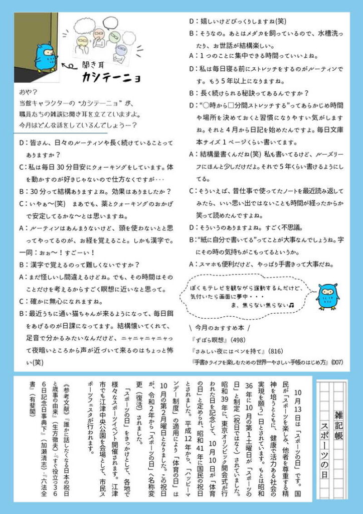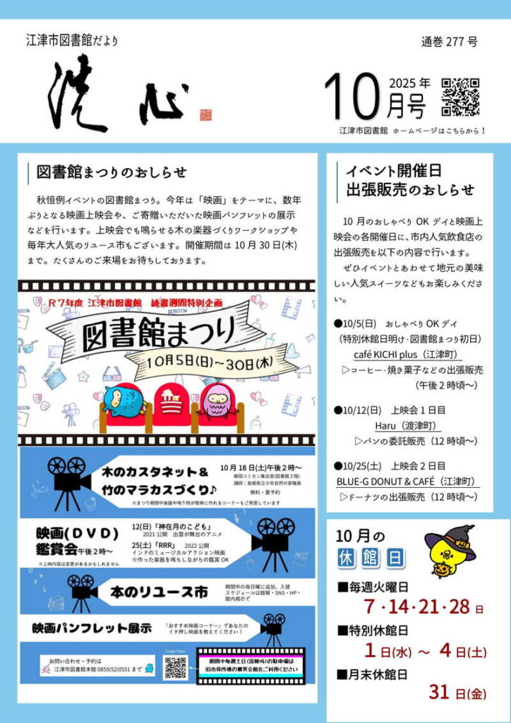 江津市図書館だより「洗心」2025年10月号 2025 10/01 洗心 2025年10月1日 2025年10月号の洗心をお届けします。(画像をクリックするとPDFファイルが開きます) 2025年10月号表紙 2025年10月号裏表紙 2025年10月号中面 2025年10月号中面 洗心 江津市図書館の記事をシェアする URLをコピーしました! 江津市図書館だより「洗心」2025年9月号 その他の記事 江津市図書館だより「洗心」2025年9月号 江津市図書館だより「洗心」2025年8月号 江津市図書館だより「洗心」2025年7月号 江津市図書館だより「洗心」2025年6月号 江津市図書館だより「洗心」2025年5月号 江津市図書館だより「洗心」2025年4月号 江津市図書館だより「洗心」2025年3月号 江津市図書館だより「洗心」2025年2月号