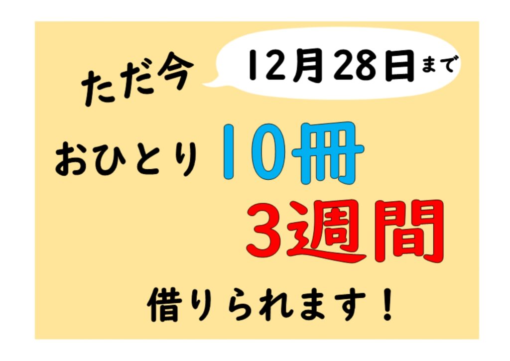 通常おひとり5冊2週間までのところ、年末年始休館に伴い10冊3週間までとなっております。この機会にぜひ♪