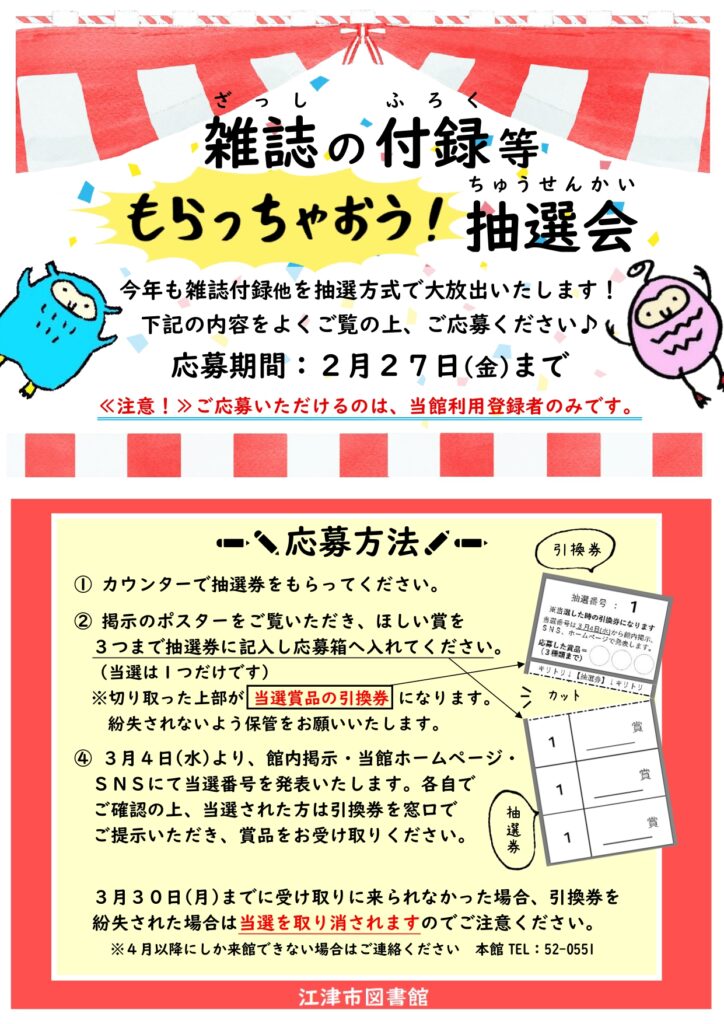 『雑誌の付録等もらっちゃおう!抽選会』本日1日から27日まで!!