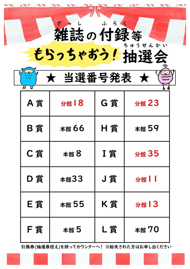 『雑誌の付録等もらっちゃおう!抽選会』の当選番号発表 2026 3/04 お知らせ 2026年3月4日 当選された方は引換券(抽選券控え)を持って図書館へお越しください。本館、分館、お間違えの無いようにお願いいたします。おめでとうございました! お知らせ 江津市図書館の記事をシェアする URLをコピーしました! 特別休館前のため 3週間10冊 貸出中です その他の記事 特別休館前のため 3週間10冊 貸出中です 本日警報発令の為本館・分館ともに休館いたします 『雑誌の付録等もらっちゃおう!抽選会』本日1日から27日まで!! 2月のおしゃべりOKデイは1日!café KICHI plusさん出店です 今日から12月28日(日)までおひとり10冊3週間! 今月のおしゃべりOKデイは2日(日) パン工房『トネリコ』さん出店! 本日10月5日から図書館まつり開催です!カフェもありますよ♪ 図書館まつり・駐車場のご案内